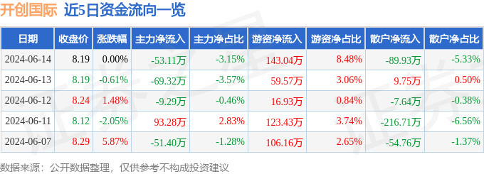 6月14日的资金流向数据方面,主力资金净流出53.11万元,占总成交额3.15%,游资资金净流入143.04万元,占总成交额8.48%,散户资金净流出89.93万元,占总成交额5.33%。