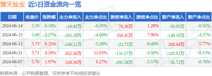 股票行情快报:雪天盐业(600929)6月14日主力资金净卖出19.42万元