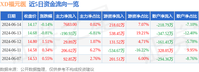股票行情快报:XD福元医(601089)6月14日主力资金净买入7683.00元