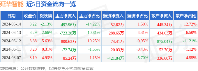 延华智能(002178)6月14日主力资金净卖出497.96万元