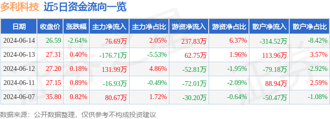多利科技(001311)6月14日主力资金净买入76.69万元