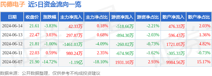 财经消息,截至2024年6月14日收盘,民德电子(300656)报收于21.61元,下跌3.83%,换手率8.58%,成交量10.91万手,成交额2.35亿元。