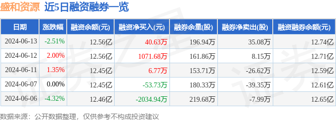 盛和资源融资融券信息显示,融资方面,当日融资买入818.03万元,融资偿还777.39万元,融资净买入40.63万元,连续3日净买入累计1119.08万元。融券方面,融券卖出37.86万股,融券偿还2.78万股,融券余量196.94万股,融券余额1758.67万元。融资融券余额12.74亿元。近5日融资融券数据一览见下表: