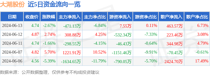 大湖股份(600257)6月13日主力资金净卖出471.13万元