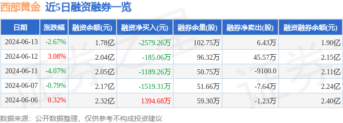 西部黄金融资融券信息显示,融资方面,当日融资买入542.18万元,融资偿还3121.44万元,融资净偿还2579.26万元。融券方面,融券卖出10.72万股,融券偿还4.29万股,融券余量102.75万股,融券余额1238.19万元。融资融券余额1.9亿元。近5日融资融券数据一览见下表: