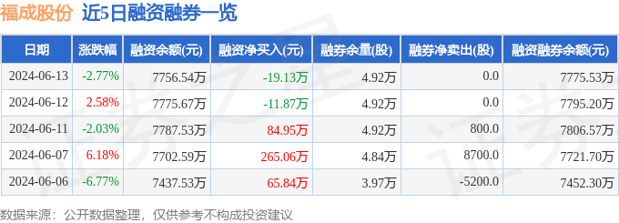 福成股份融资融券信息显示,融资方面,当日融资买入130.77万元,融资偿还149.9万元,融资净偿还19.13万元。融券方面,融券卖出0.0股,融券偿还0.0股,融券余量4.92万股,融券余额18.99万元。融资融券余额7775.53万元。近5日融资融券数据一览见下表: