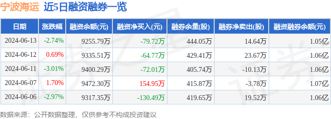 宁波海运融资融券信息显示,融资方面,当日融资买入143.33万元,融资偿还223.05万元,融资净偿还79.72万元。融券方面,融券卖出23.26万股,融券偿还8.62万股,融券余量444.05万股,融券余额1261.1万元。融资融券余额1.05亿元。近5日融资融券数据一览见下表:
