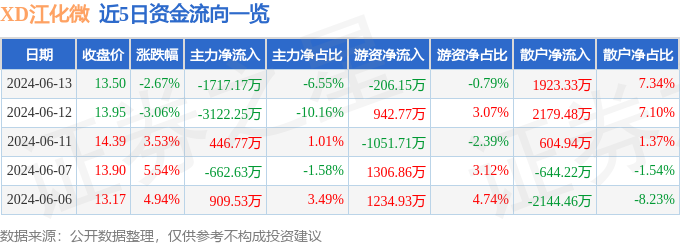 XD江化微(603078)6月13日主力资金净卖出1717.17万元