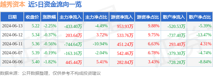 财经消息,截至2024年6月13日收盘,越秀资本(000987)报收于5.22元,下跌2.25%,换手率0.37%,成交量18.41万手,成交额9655.92万元。
