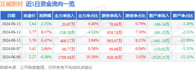 财经消息,截至2024年6月13日收盘,正威新材(002201)报收于5.64元,下跌2.25%,换手率2.39%,成交量15.53万手,成交额8910.43万元。