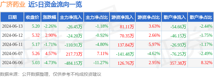 股票行情快报:广济药业(000952)6月13日主力资金净卖出26.45万元
