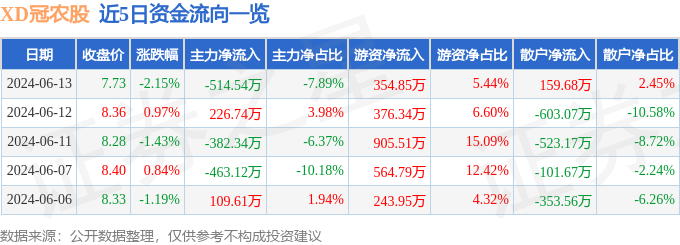 6月13日的资金流向数据方面,主力资金净流出514.54万元,占总成交额7.89%,游资资金净流入354.85万元,占总成交额5.44%,散户资金净流入159.68万元,占总成交额2.45%。