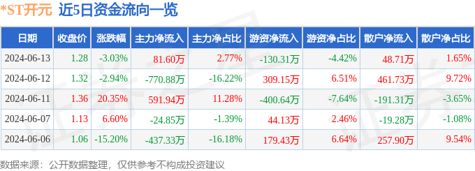 *ST开元(300338)6月13日主力资金净买入81.60万元