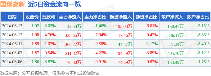 国创高新(002377)6月13日主力资金净卖出42.53万元