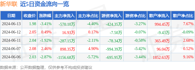 财经消息,截至2024年6月13日收盘,新华联(000620)报收于1.98元,下跌3.41%,换手率1.56%,成交量64.78万手,成交额1.3亿元。