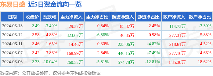 财经消息,截至2024年6月13日收盘,东易日盛(002713)报收于2.49元,下跌3.49%,换手率3.4%,成交量13.79万手,成交额3479.92万元。