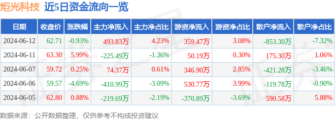 炬光科技(688167)6月12日主力资金净买入493.83万元