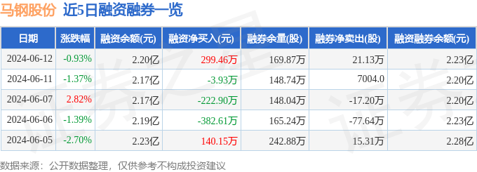 马钢股份融资融券信息显示,融资方面,当日融资买入403.86万元,融资偿还104.41万元,融资净买入299.46万元。融券方面,融券卖出24.41万股,融券偿还3.28万股,融券余量169.87万股,融券余额363.52万元。融资融券余额2.23亿元。近5日融资融券数据一览见下表: