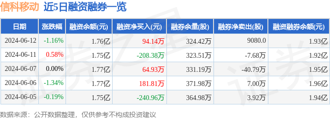 信科移动融资融券信息显示,融资方面,当日融资买入293.62万元,融资偿还199.47万元,融资净买入94.14万元。融券方面,融券卖出9.94万股,融券偿还9.03万股,融券余量324.42万股,融券余额1664.28万元。融资融券余额1.93亿元。近5日融资融券数据一览见下表: