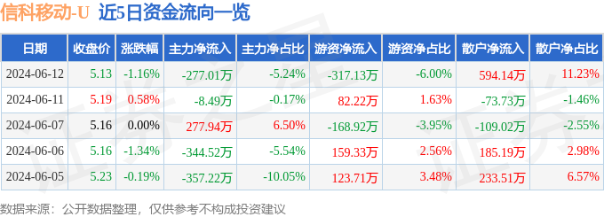 6月12日的资金流向数据方面,主力资金净流出277.01万元,占总成交额5.24%,游资资金净流出317.13万元,占总成交额6.0%,散户资金净流入594.14万元,占总成交额11.23%。