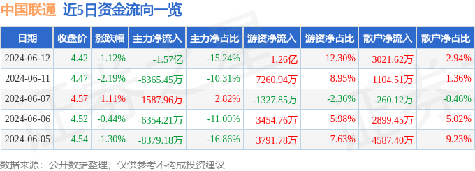 中国联通(600050)6月12日主力资金净卖出1.57亿元