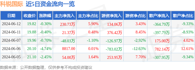 6月12日的资金流向数据方面,主力资金净流入230.73万元,占总成交额5.9%,游资资金净流入134.06万元,占总成交额3.43%,散户资金净流出364.79万元,占总成交额9.33%。