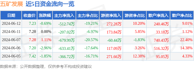 股票行情快报:五矿发展(600058)6月12日主力资金净卖出512.74万元