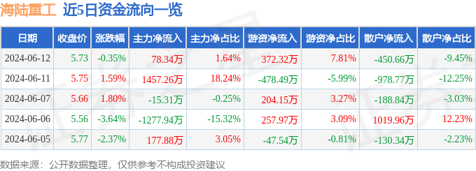 财经消息,截至2024年6月12日收盘,海陆重工(002255)报收于5.73元,下跌0.35%,换手率1.29%,成交量8.37万手,成交额4767.59万元。