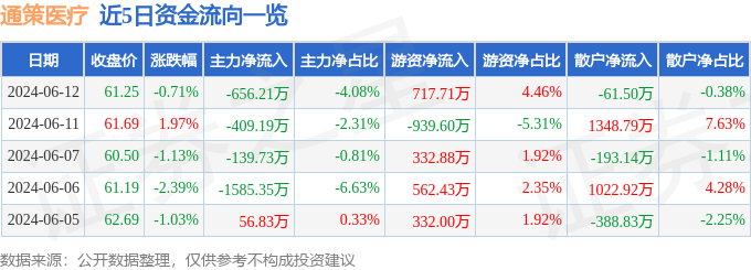 财经消息,截至2024年6月12日收盘,通策医疗(600763)报收于61.25元,下跌0.71%,换手率0.82%,成交量2.61万手,成交额1.61亿元。