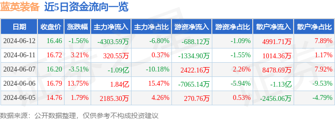 财经消息,截至2024年6月12日收盘,蓝英装备(300293)报收于16.46元,下跌1.56%,换手率13.69%,成交量38.39万手,成交额6.33亿元。