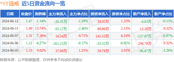 *ST迪威(300167)6月12日主力资金净卖出35.31万元