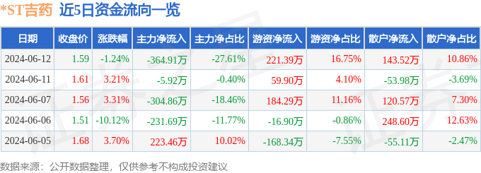 财经消息,截至2024年6月12日收盘,*ST吉药(300108)报收于1.59元,下跌1.24%,换手率1.26%,成交量8.26万手,成交额1321.5万元。