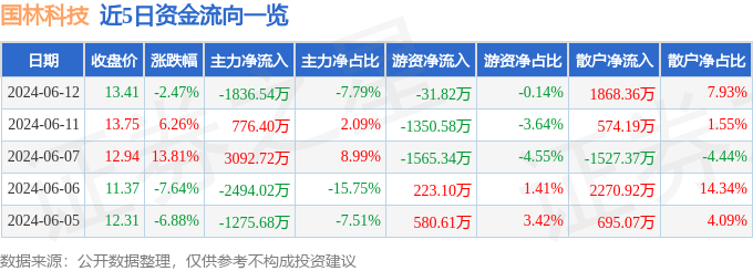 财经消息,截至2024年6月12日收盘,国林科技(300786)报收于13.41元,下跌2.47%,换手率12.19%,成交量17.55万手,成交额2.36亿元。