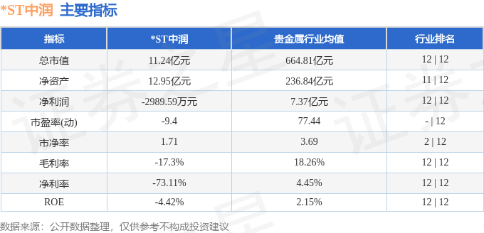 *ST中润2024年一季报显示,公司主营收入4998.35万元,同比下降29.48%;归母净利润-2989.59万元,同比上升21.11%;扣非净利润-2816.7万元,同比上升24.47%;负债率44.05%,财务费用1253.38万元,毛利率-17.3%。*ST中润(000506)主营业务:以黄金为主要品种的矿业开采与房地产开发建设、销售及自有房产的出租。