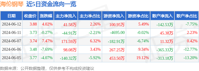 海伦钢琴(300329)6月12日主力资金净买入41.58万元