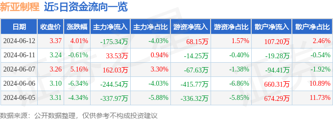 新亚制程(002388)6月12日主力资金净卖出175.34万元