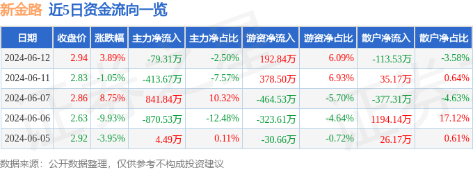 财经消息,截至2024年6月12日收盘,新金路(000510)报收于2.94元,上涨3.89%,换手率1.92%,成交量10.89万手,成交额3168.66万元。