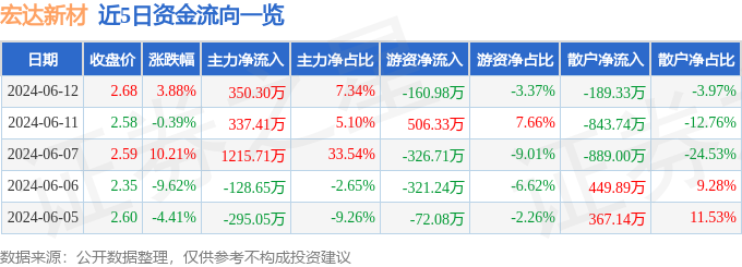 6月12日的资金流向数据方面,主力资金净流入350.3万元,占总成交额7.34%,游资资金净流出160.98万元,占总成交额3.37%,散户资金净流出189.33万元,占总成交额3.97%。