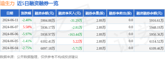 迪生力融资融券信息显示,融资方面,当日融资买入31.38万元,融资偿还62.66万元,融资净偿还31.29万元。融券方面,融券卖出0.0股,融券偿还0.0股,融券余量2.89万股,融券余额11.73万元。融资融券余额5916.61万元。近5日融资融券数据一览见下表: