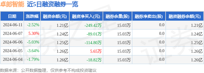 卓郎智能融资融券信息显示,融资方面,当日融资买入67.02万元,融资偿还316.43万元,融资净偿还249.42万元。融券方面,融券卖出0.0股,融券偿还0.0股,融券余量15.03万股,融券余额23.3万元。融资融券余额1.21亿元。近5日融资融券数据一览见下表: