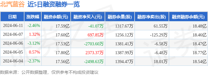 北汽蓝谷融资融券信息显示,融资方面,当日融资买入7319.08万元,融资偿还7360.14万元,融资净偿还41.07万元。融券方面,融券卖出74.22万股,融券偿还12.67万股,融券余量1317.67万股,融券余额8894.28万元。融资融券余额18.48亿元。近5日融资融券数据一览见下表: