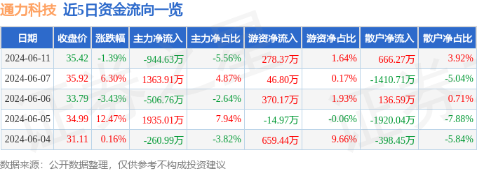 财经消息,截至2024年6月11日收盘,通力科技(301255)报收于35.42元,下跌1.39%,换手率18.3%,成交量4.98万手,成交额1.7亿元。
