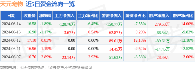天元宠物(301335)6月14日主力资金净卖出128.76万元
