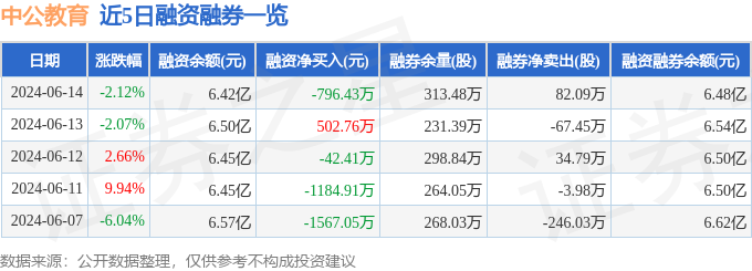 中公教育融资融券信息显示,融资方面,当日融资买入2177.03万元,融资偿还2973.47万元,融资净偿还796.43万元。融券方面,融券卖出95.1万股,融券偿还13.01万股,融券余量313.48万股,融券余额579.93万元。融资融券余额6.48亿元。近5日融资融券数据一览见下表: