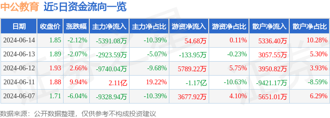 财经消息,截至2024年6月14日收盘,中公教育(002607)报收于1.85元,下跌2.12%,换手率5.69%,成交量276.94万手,成交额5.19亿元。