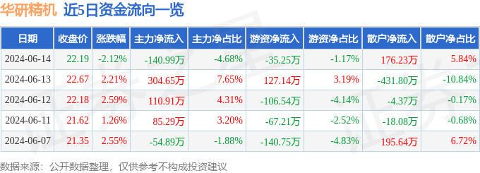 财经消息,截至2024年6月14日收盘,华研精机(301138)报收于22.19元,下跌2.12%,换手率4.52%,成交量1.36万手,成交额3015.58万元。
