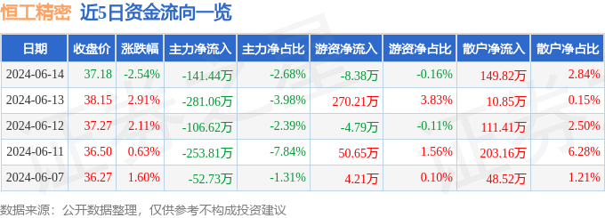 财经消息,截至2024年6月14日收盘,恒工精密(301261)报收于37.18元,下跌2.54%,换手率6.78%,成交量1.42万手,成交额5275.73万元。