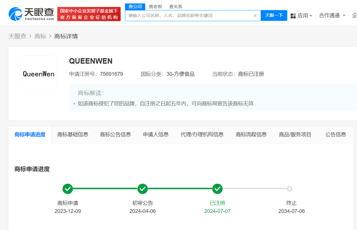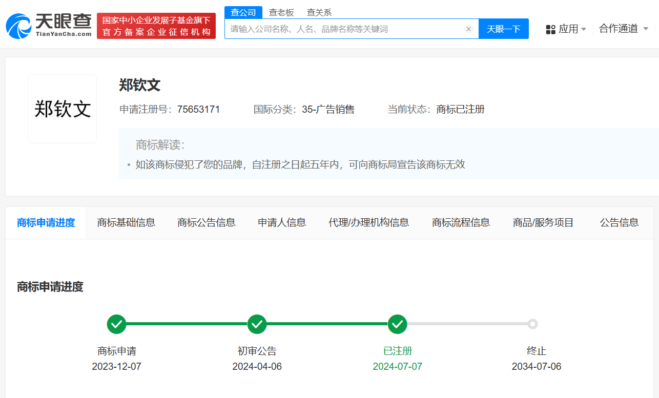 天眼查知识产权信息显示,去年12月,郑钦文本人申请注册多枚“郑钦文”以及个人头像商标,国际分类包括广告销售、教育娱乐、科学仪器、啤酒饮料、日化用品等。商标流程信息显示,今年7月,上述多数商标已成功注册。同时,郑钦文还申请注册“QueenWen”“淘米姐”“淘蜜姐”商标,其中多数也已于今年7月完成注册。