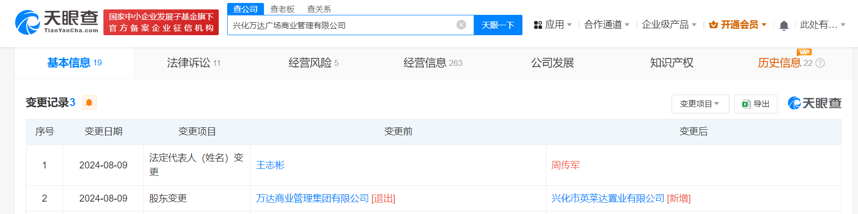 天眼查app显示,近日,兴化万达广场商业管理有限公司发生变更,原全资股东万达商业管理集团有限公司退出,新增兴化市英莱达置业有限公司为股东并全资持股,同时,法定代表人由王志彬变更为周传军。