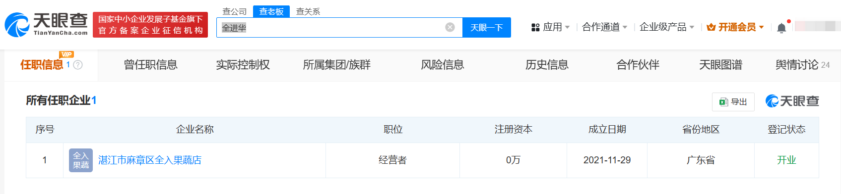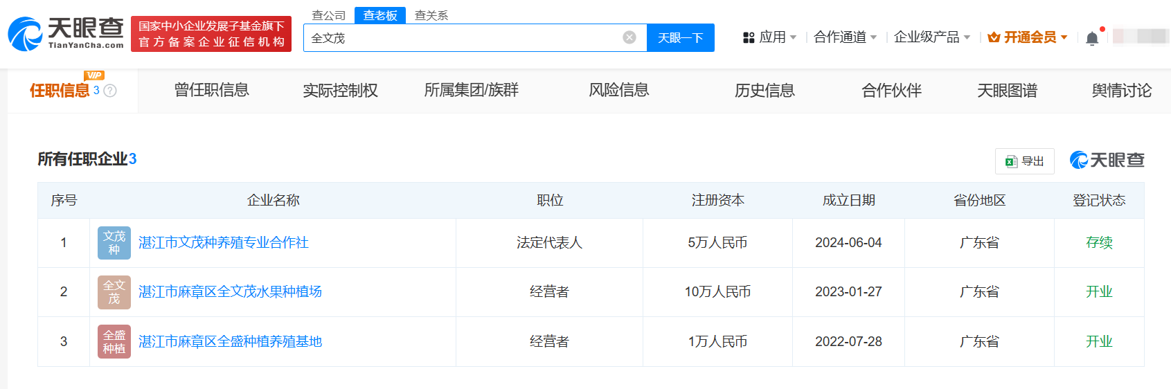 天眼查app显示,全红婵父亲全文茂关联3家企业,分别为湛江市麻章区全盛种植养殖基地、湛江市麻章区全文茂水果种植场、湛江市文茂种养殖专业合作社,其中前两家分别成立于2022年、2023年,后一家湛江市文茂种养殖专业合作社成立于今年6月。该合作社出资总额为5万人民币,经营范围含花卉种植、水果种植、谷物种植、蔬菜种植等。此外,全红婵哥哥全进华经营一家果蔬店——湛江市麻章区全入果蔬店。此前,媒体报道称,虽然全红婵爆火,但家人每天依旧有干不完的活。全文茂接受采访表示,不能靠女儿的名气坐享其成,做父母的要谨慎一点,不能因过眼云烟的东西影响孩子。